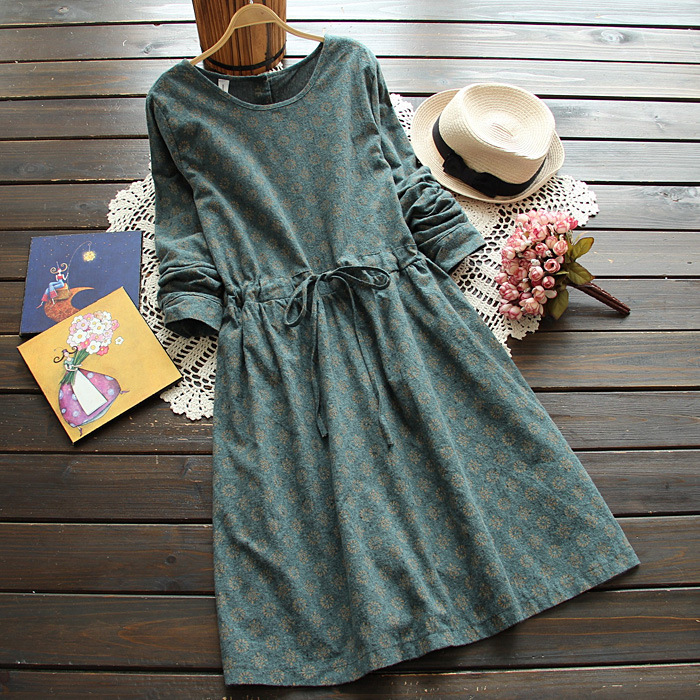 9181新款2015秋季日系森女風印花收腰系帶長袖圓領連衣裙長裙 /