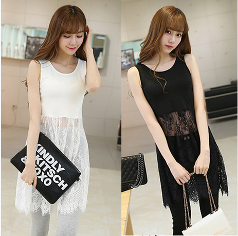 2015速賣通內搭中長款純棉吊帶蕾絲刺繡背心打底裙修身透視連衣裙 /
