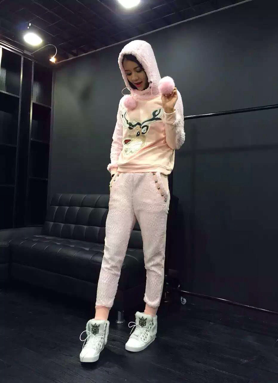 歐洲站冬裝新款時尚卡通小鹿兔毛珠片休閑連帽衛衣 褲子套裝女 /