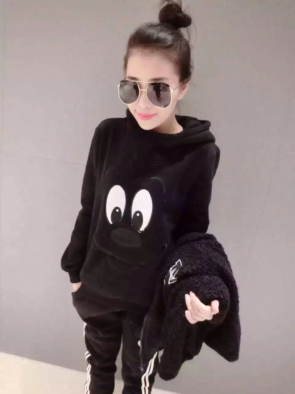歐洲站15冬裝新款時尚韓版卡通加棉加絨加厚休閑連帽衛衣套裝女 /