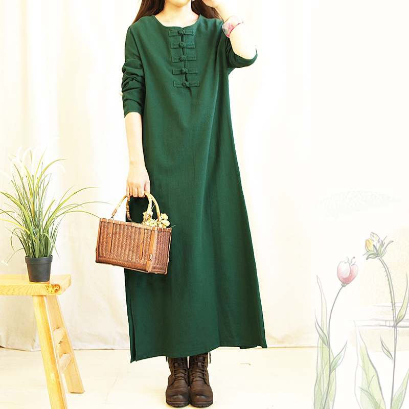 2015冬裝新款 中國風盤扣連衣裙寬松長袖氣質超長加厚裙子森女系 /