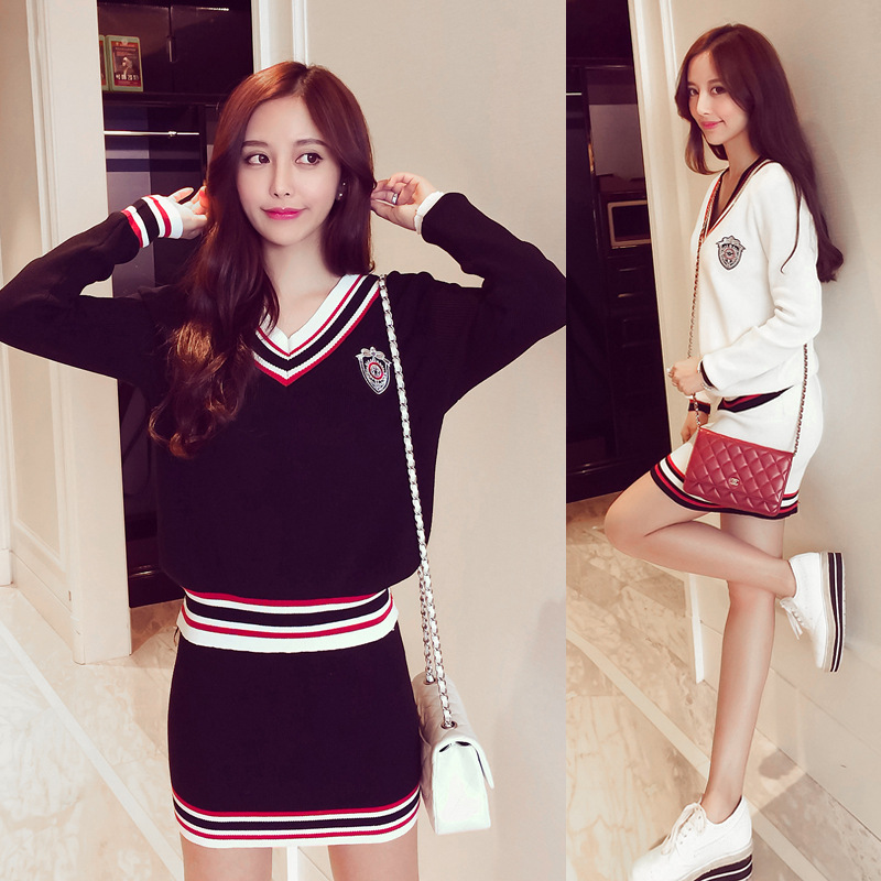 學院風時尚顯瘦V領針織上衣+短裙套裝 /