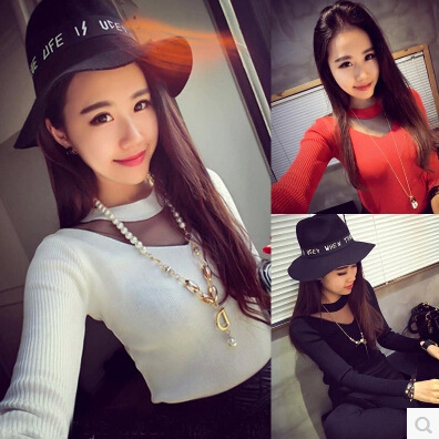 冬季新品歐美范網紗拼接小性感透視修身百搭打底針織衫 /