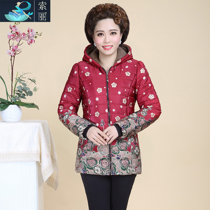 新款冬季中年女式印花棉服媽媽裝冬裝上衣中老年女裝加絨加厚棉衣 /