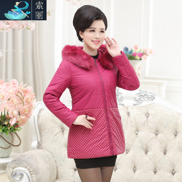 新款休閑圓點印花羽絨棉服休閑女式媽媽裝拼接棉服中老年棉衣女冬 /
