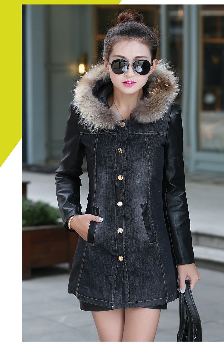 2015秋冬新款加厚牛仔棉衣女中長款韓版修身皮袖真毛領棉服女外套 /