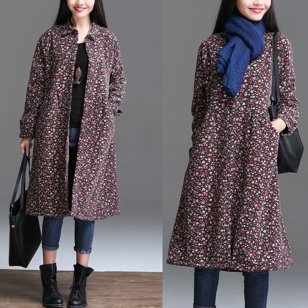2015實(shí)拍秋冬款棉麻碎花印花民族文藝范加厚加絨中長(zhǎng)款風(fēng)衣外套女 /