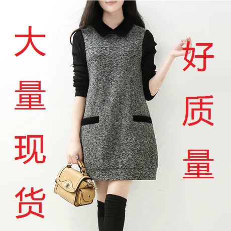 2015冬裝 淡雅針織馬海毛 拼接翻領(lǐng)長(zhǎng)袖女款連衣裙 /