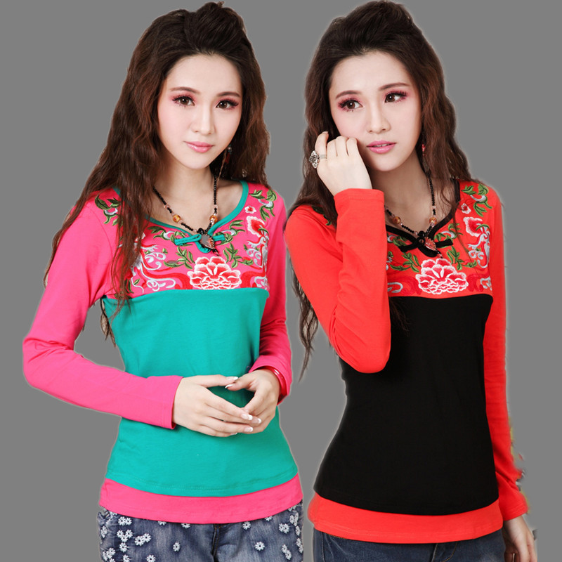 實拍2015秋冬新款民族風上衣純棉繡花長袖T恤打底衫大碼女裝 /