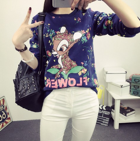 冬大碼女長袖彩繪小鹿印花上衣加絨加厚衛衣外套 /