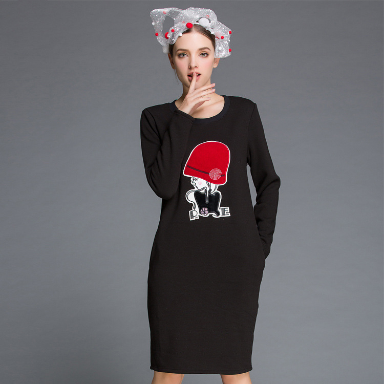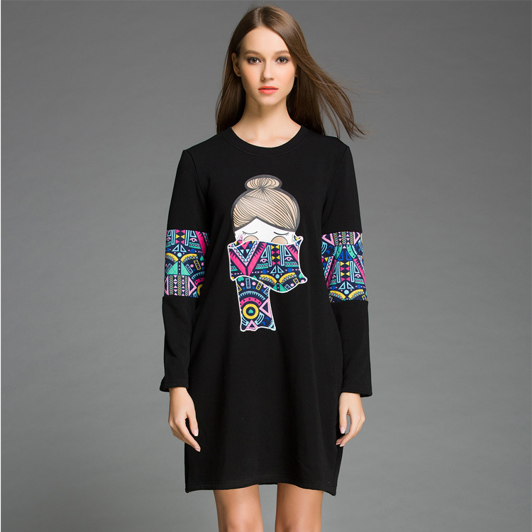 歐美大碼女裝打底裙2015冬裝新款卡通女孩印花長袖加絨連衣裙 /