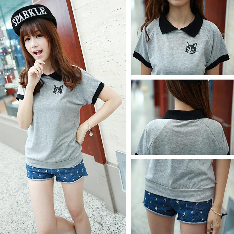 夏季新款2014韓版小貓咪氣質修身棉翻領短袖T恤女上衣 /