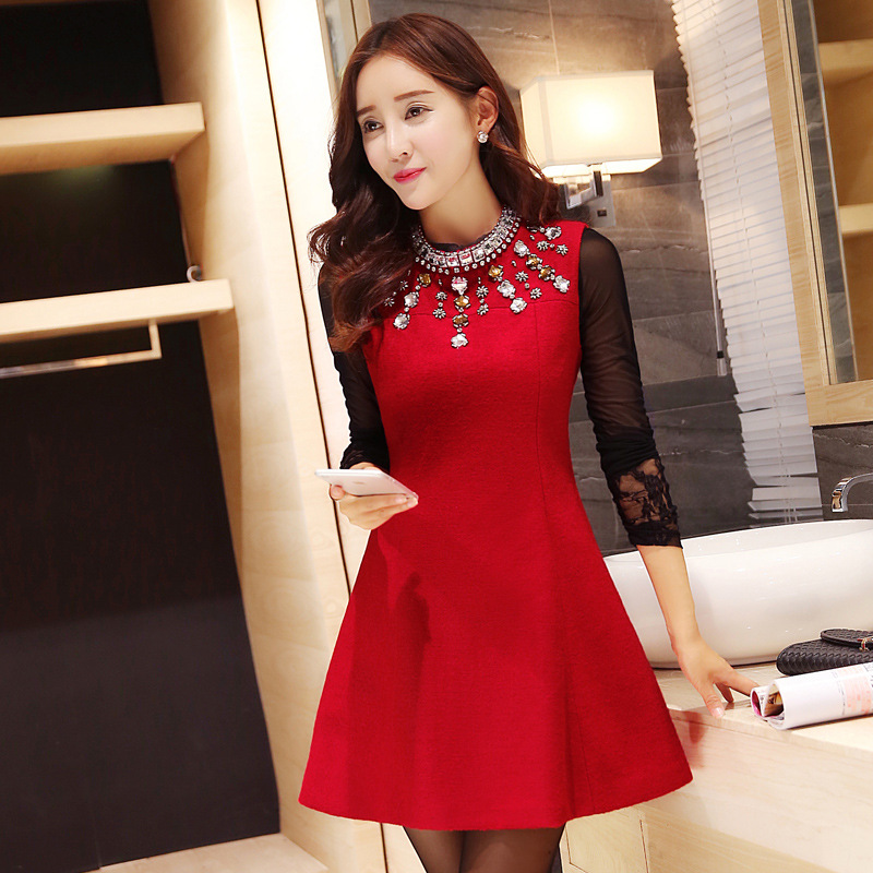 2015廠家直銷冬季女裝鑲鉆圓領無袖純色收腰韓版連衣裙批發(fā) /