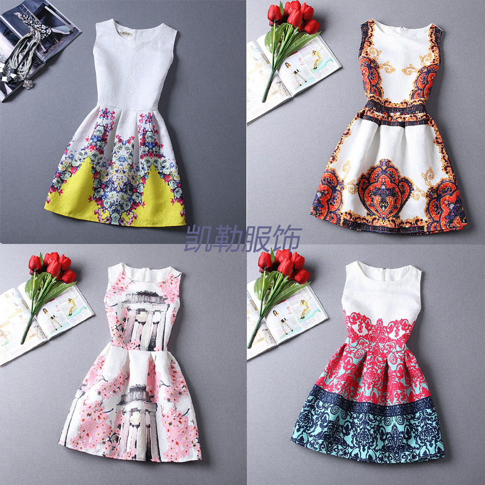 簡介: 貨源類別現貨 主圖來源實拍有模特 風格歐美 復古 圖案印花 工藝數碼印花 產地深圳 庫存類型整單 款式基本款 組合形式單件 裙長中裙 裙型A字裙 領型圓領 袖長無袖 腰型中腰 衣門襟套頭 流行元素拼接,印花 上市年份/季節2015夏季 面料名稱提花布 主面料成分聚酯纖維(滌綸) 主面料成分的含量100(%)