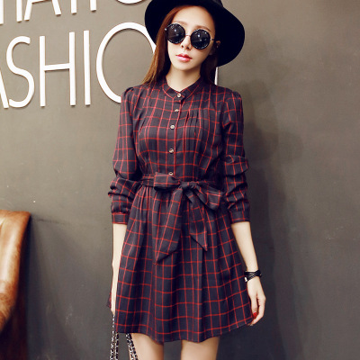 2015秋冬新款韓版淑女風長袖立領蝴蝶結腰帶格子連衣裙 /
