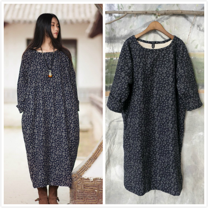 原創棉麻布衣設計加厚連衣裙保暖夾袍子長袍滿天星蘭碎花大碼長袍 /