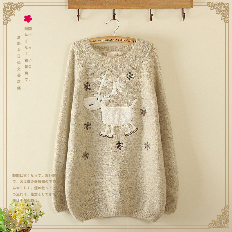 日系森女系秋冬新款毛 雪花麋鹿 圓領寬松 套頭針織毛衣 女裝批發 /