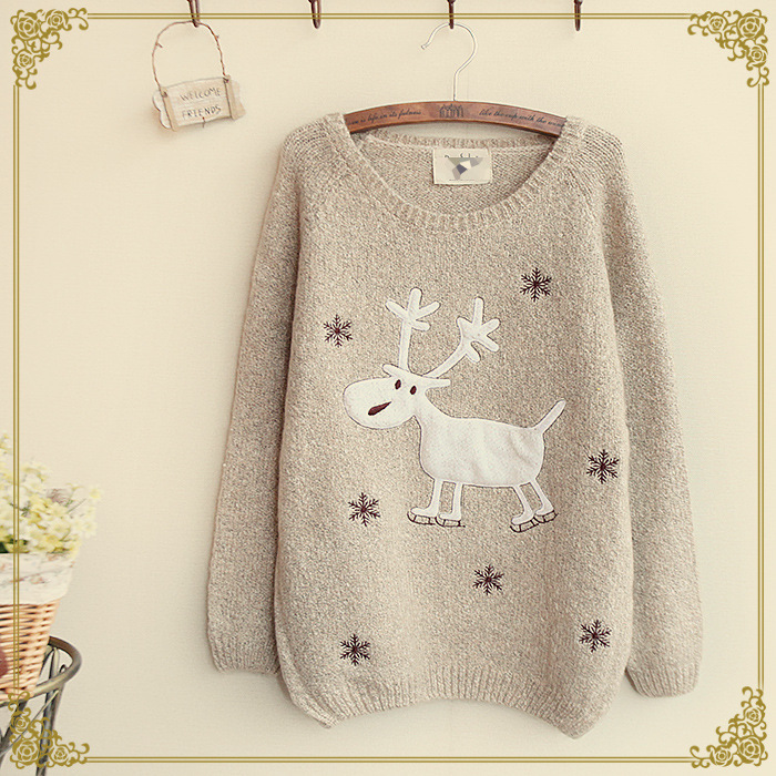 2015春裝新款森女系日系 雪花麋鹿圓領(lǐng)寬松 套頭針織毛衣女裝批發(fā) /