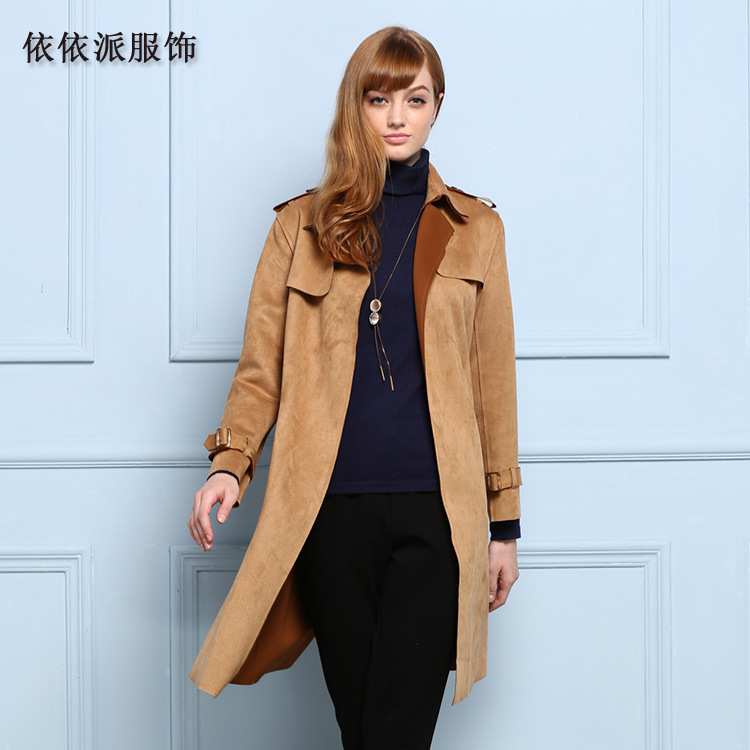 2015歐美秋季新款咖色中長(zhǎng)款風(fēng)衣 蝴蝶結(jié)腰帶 修身 時(shí)尚外套 /