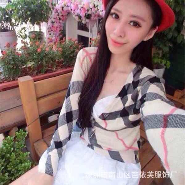 B家大碼修身短款V領長袖條紋格子印花針織開衫棉女毛衣外套批發 /
