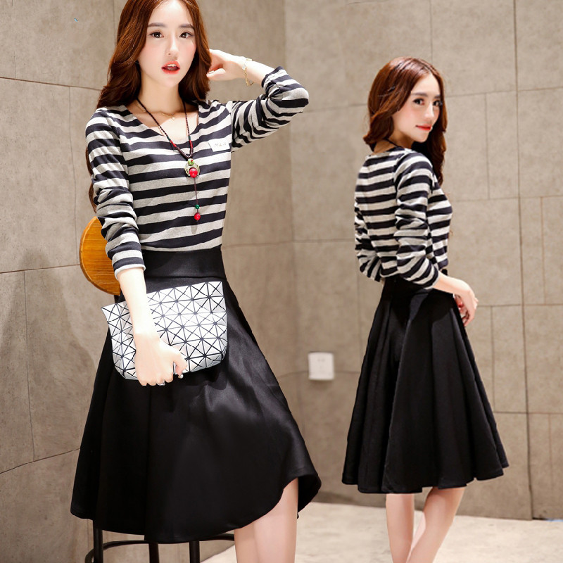 2015秋裝新款條紋長袖T恤A型大擺兩件套裙子 /