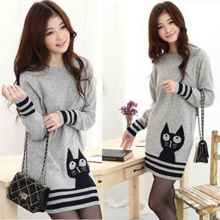 秋冬裝新款百搭上衣甜美貓咪圓領(lǐng)加厚中長款毛衣女打底毛衣 /