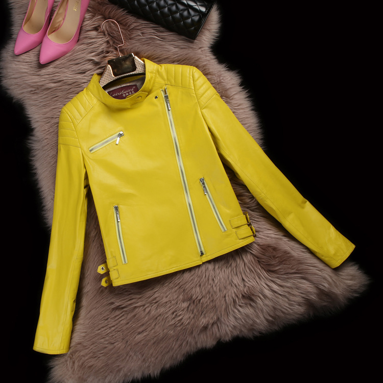 簡介: 貨源類別訂貨 最快出貨時間1-3天 產地河北辛集 品牌錦媚 貨號1515 風格韓版 衣長短款(40cm<衣長≤50cm) 流行元素肩章 主圖來源實拍無模特 上市年份/季節(jié)2015春季 皮質分類皮革 皮質羊皮 顏色黑色,黃色 尺碼S,M,L,XL 皮質種類羊皮 面料真皮