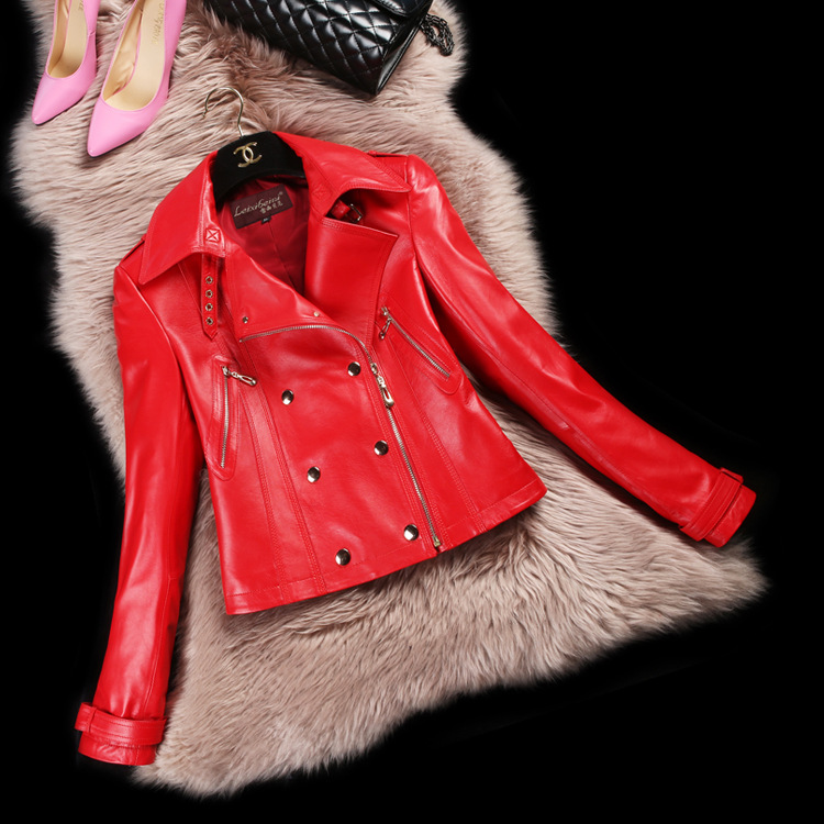 2015最新款歐洲站真皮皮衣女 短款修身紅色雙排扣機車服外套批發(fā) /