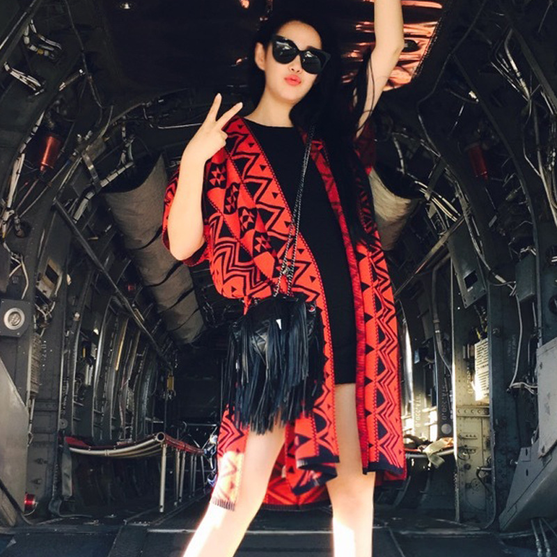 左岸瀟同款韓版大碼羊毛毛衣中長款針織開衫紅色披肩外套1007 /