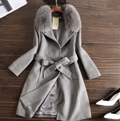 冬裝羊絨呢子大衣毛呢外套女中長款真狐貍大毛領修身 /
