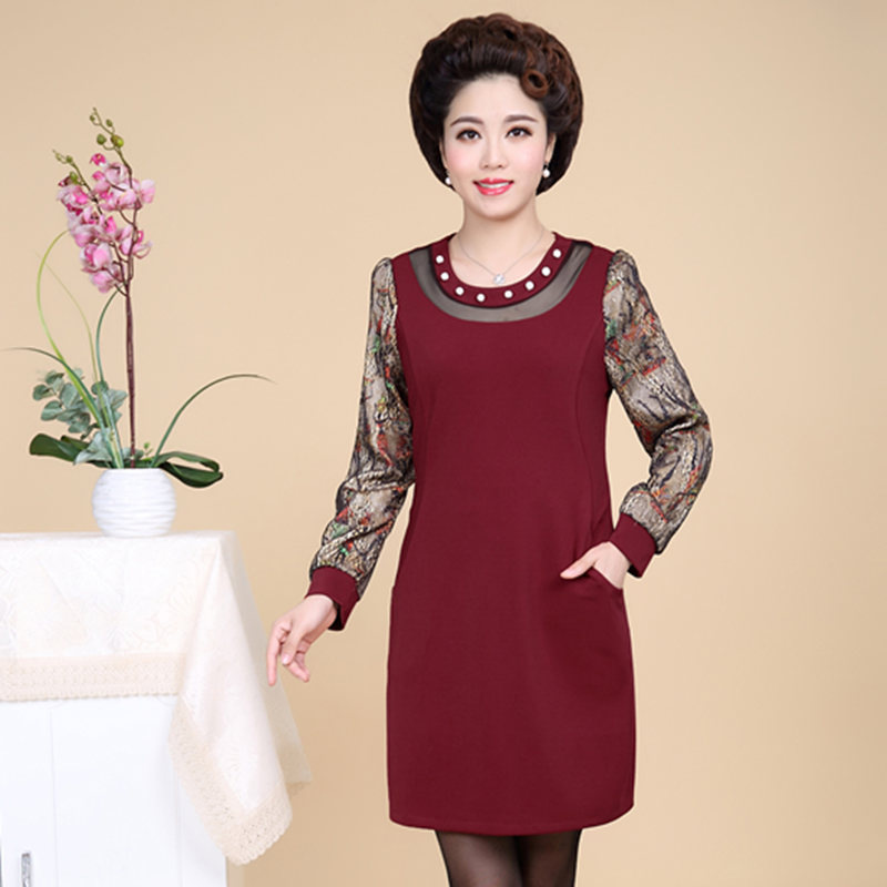 2015秋冬新款韓版中老年女裝媽媽裝中長款加絨加厚保暖蕾絲連衣裙 /