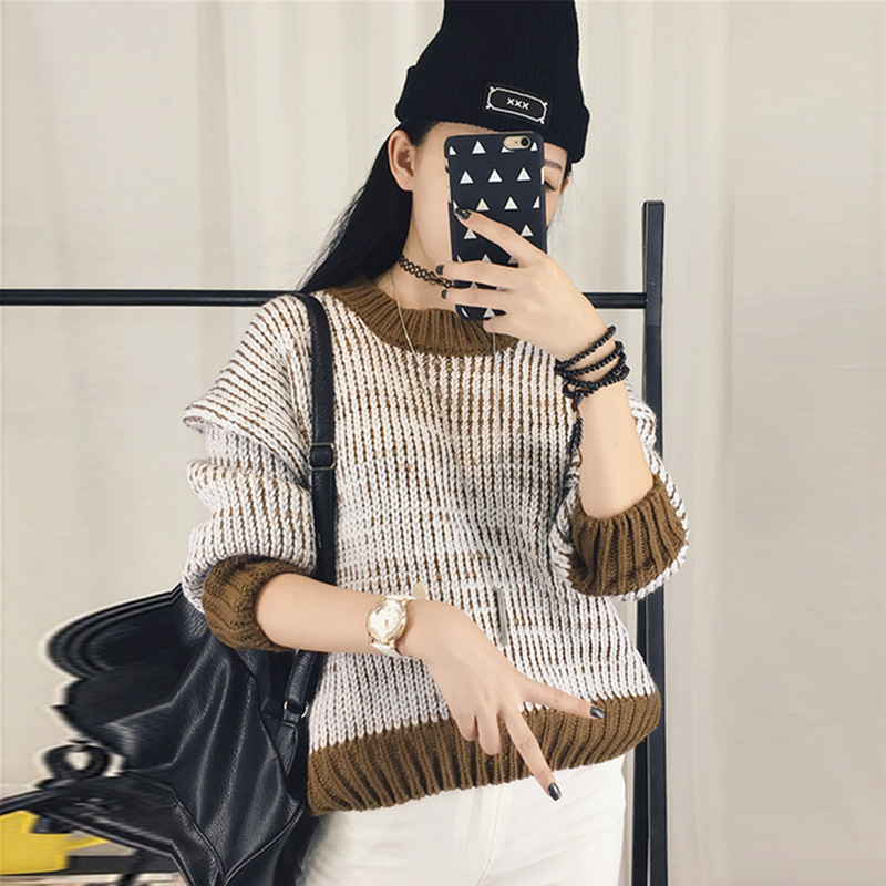 拼接撞色圓領長袖女式套頭針織衫 韓版寬松顯瘦潮流秋冬新款女裝 /
