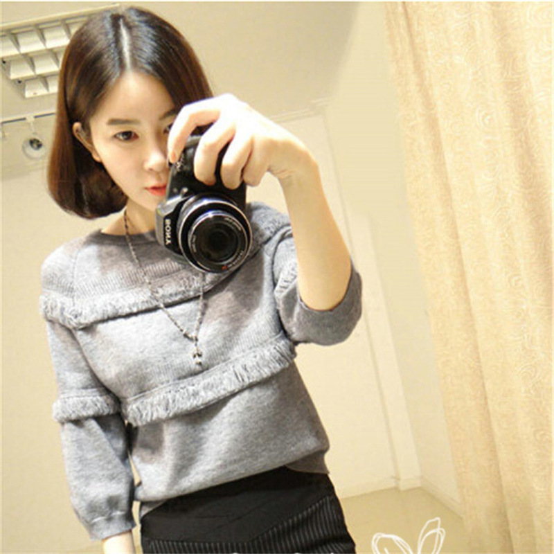 圓領七分袖短款下擺木耳邊女裝 2015秋冬新款女式套頭針織衫 批發(fā) /