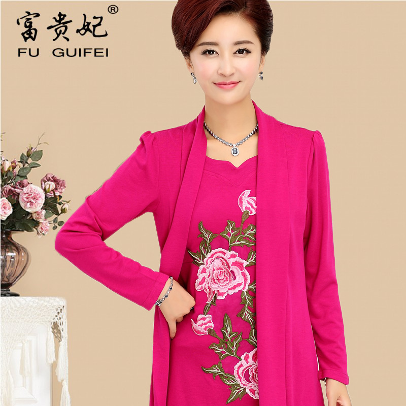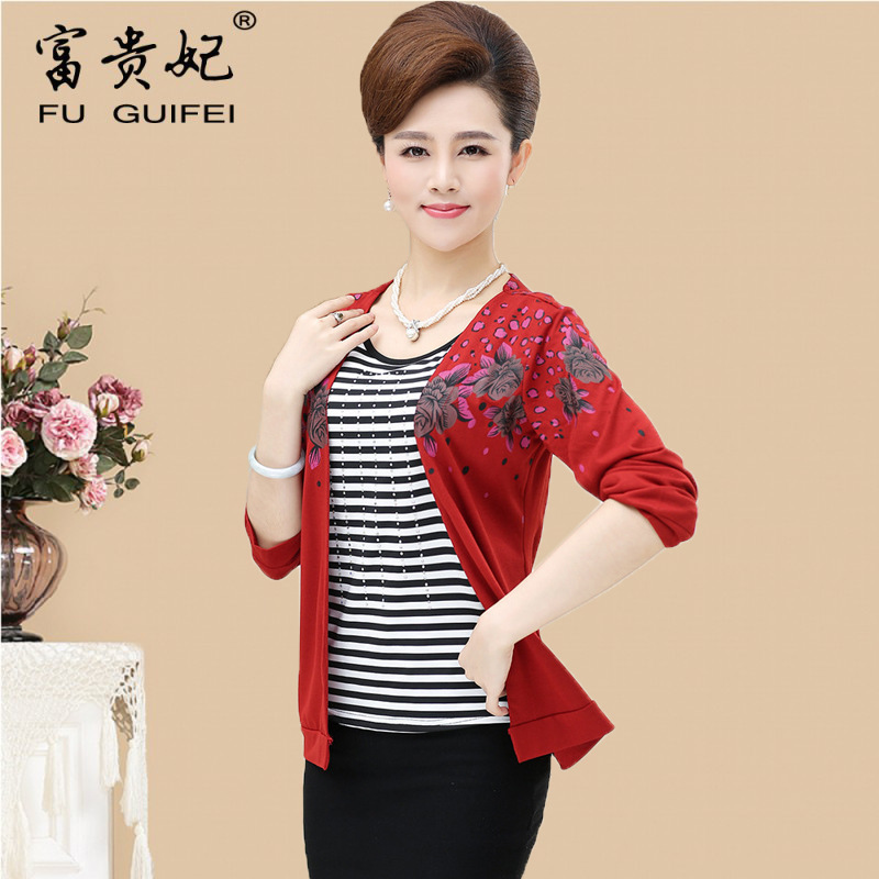中年人媽媽裝時尚秋裝大碼長袖T恤假兩件套中老年女裝牡丹花上衣 /