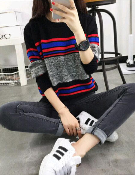 2015秋季韓國新款圓領條紋套頭毛衣 /