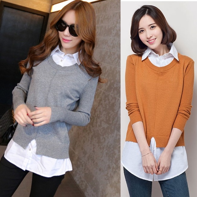2015秋冬新款唯品會女裝純色針織打底衫套頭毛衣襯衫領(lǐng)假兩件上衣 /