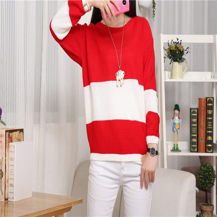 2015秋季新款女裝圓領寬松撞色韓版套頭毛針織衫 /