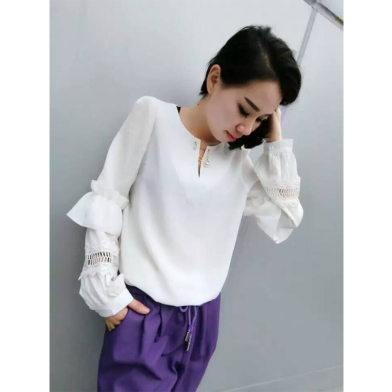 微信貨源 2016早春新款女裝韓版高品質荷葉袖鏤空雪紡衫代理加盟 /