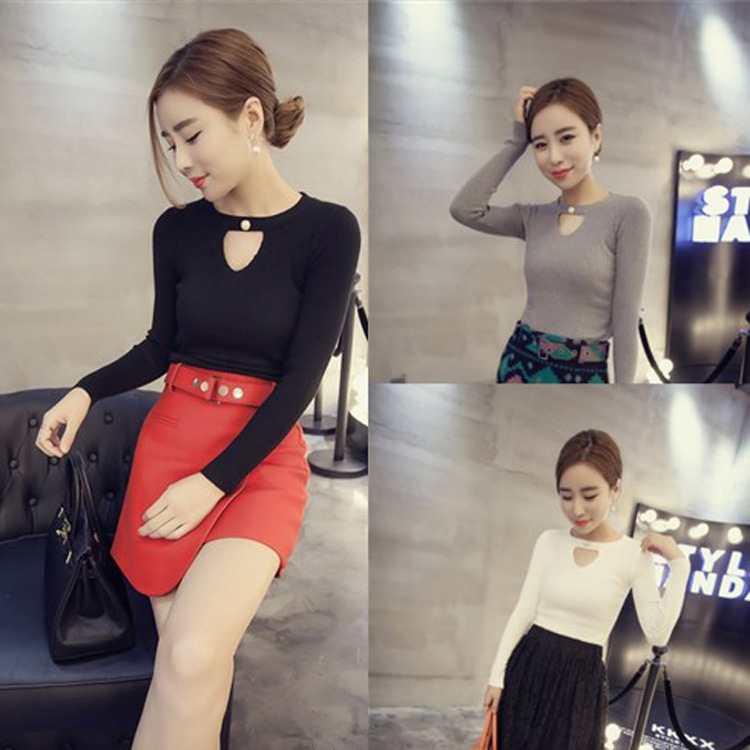 2015秋裝新款鏤空紐扣針織衫圓領(lǐng)長袖內(nèi)搭修身打底衫女裝 /