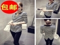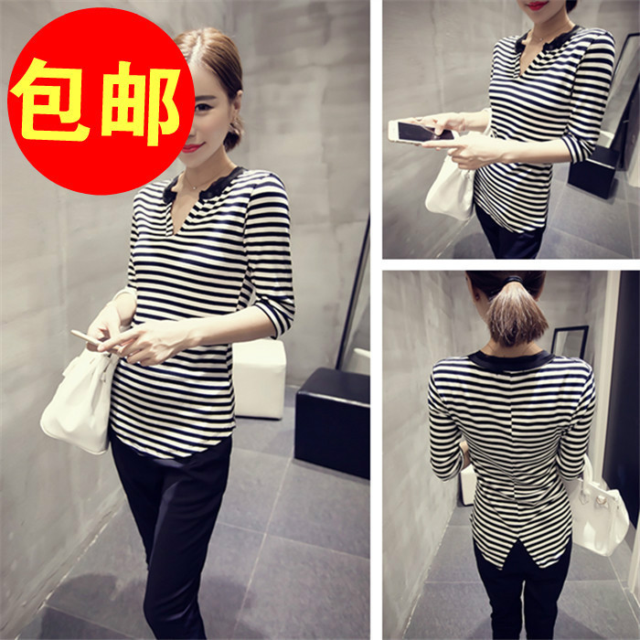 包郵女 早秋新品 韓系時尚開口V領橫條紋七分袖百搭顯瘦t恤衫上衣 /