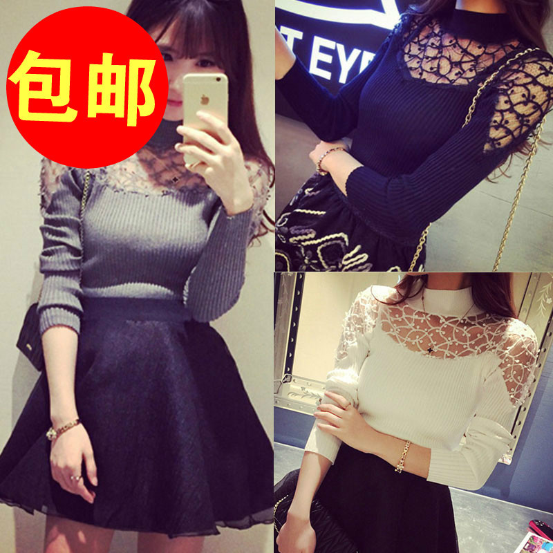 包郵女 秋冬新品 韓版立體鉤花修身百搭小性感豎紋長袖打底針織衫 /