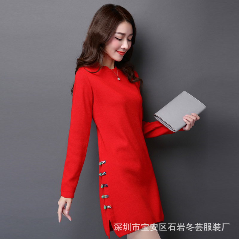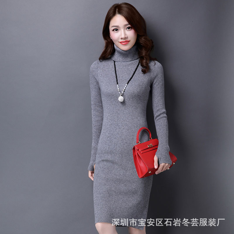 2015冬裝新款時尚高領開叉毛衣中長款修身長袖打底針織連衣裙女 /