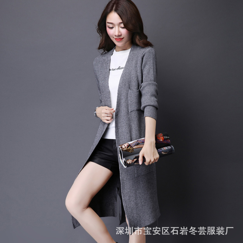 2015秋季女裝 歐美高端純色女式針織衫 長款口袋開叉毛衣外套開衫 /