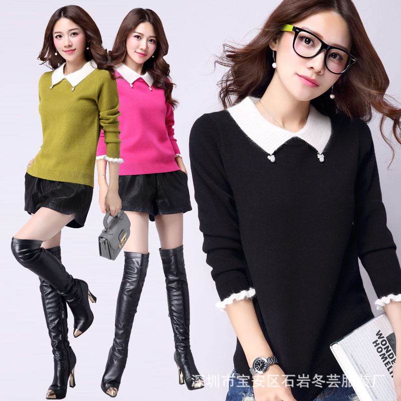 秋冬新款針織衫 女 韓版時尚娃娃領長袖套頭毛衣女 短款毛衣批發 /
