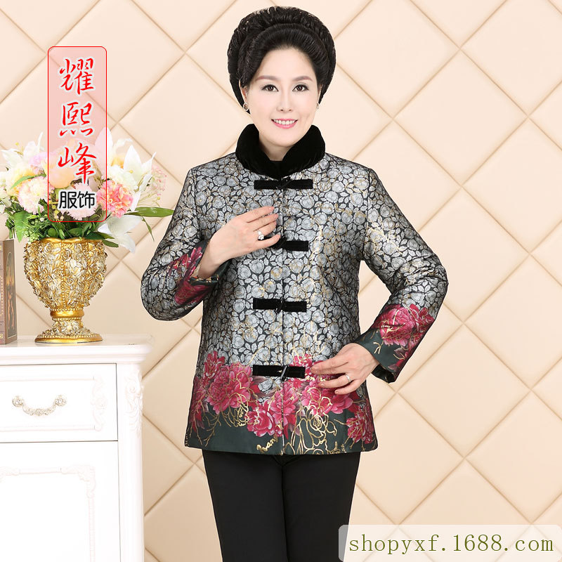 冬季新款中老年女裝棉衣高領圍脖大碼媽媽裝老年人亮金唐裝上衣 /