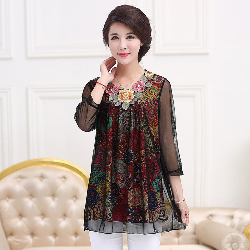 夏裝新款中老年蕾絲衫韓版寬松大碼媽媽裝 印花透氣七分袖V領(lǐng)女裝 /