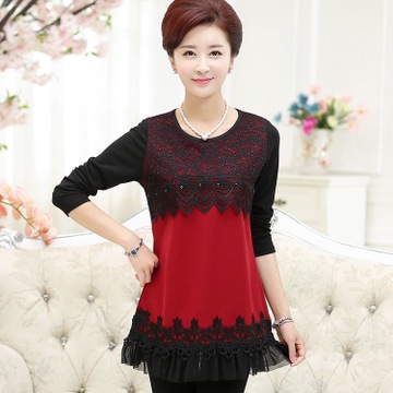 秋季新款中老年女裝長款針織衫長袖大碼蕾絲邊媽媽裝打底衫 批發 /