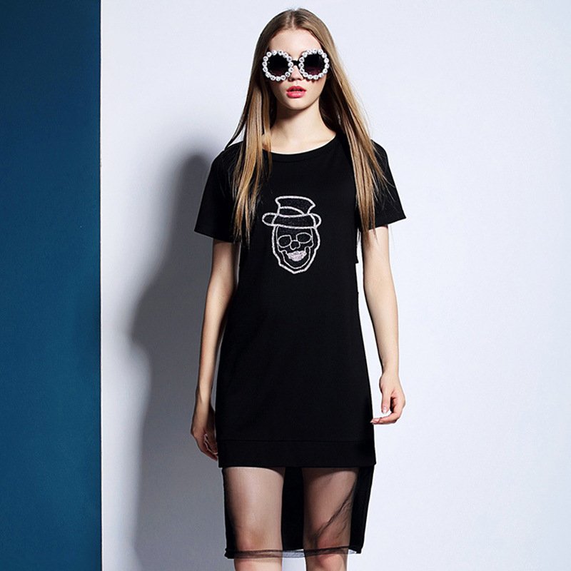 一件代發夏時尚氣質修身棉紡短袖裙子重工鑲鉆骷髏頭短袖連衣裙爆 /
