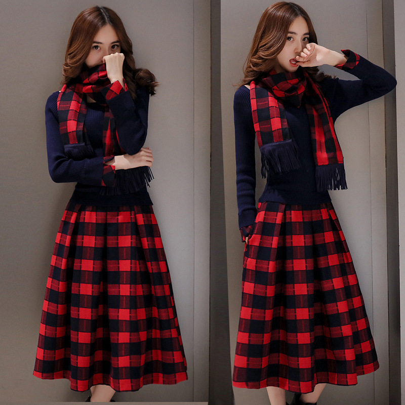 2015秋冬新品女裝紅格子A字裙中長款打底裙長袖三件套連衣裙 /