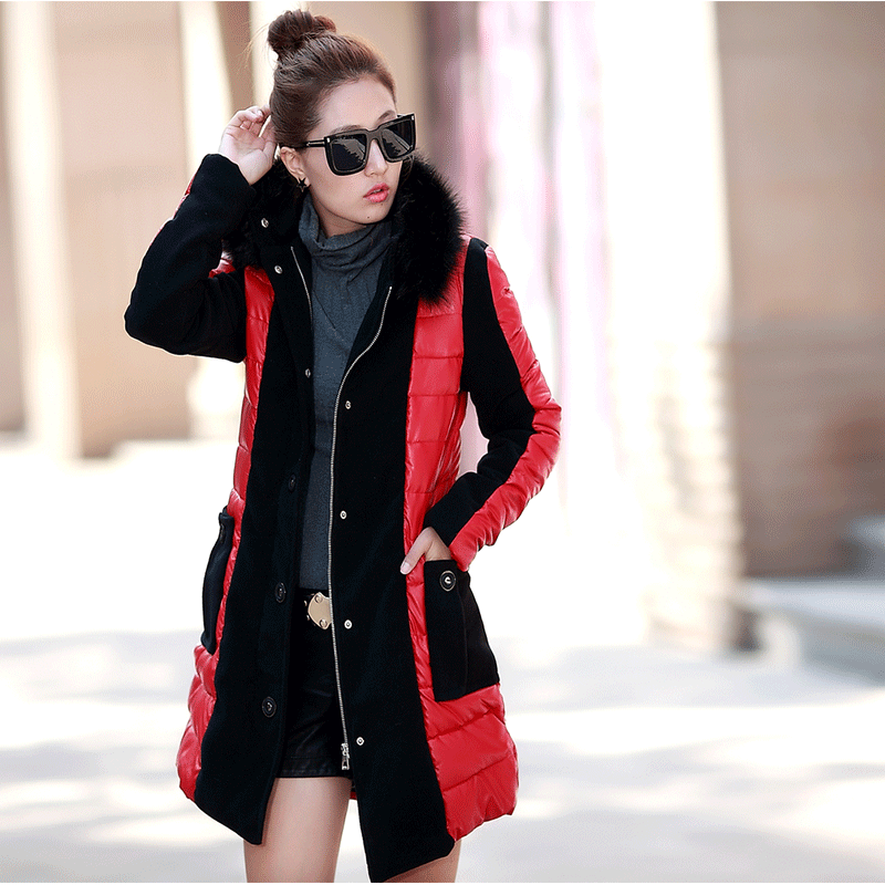 新款pu皮中長袖大碼女裝外套棉衣 拼色羽絨服女式棉服大毛領 /